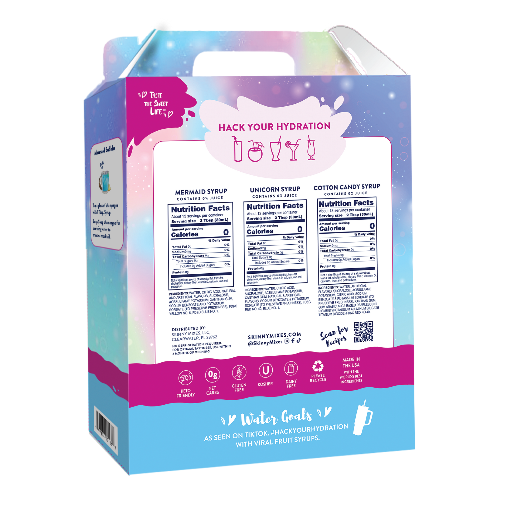 Indulge in your wildest flavor fantasies with our sugar-free syrup trio! This trial pack features Mermaid, Unicorn, and Cotton Candy flavors to elevate any drink.